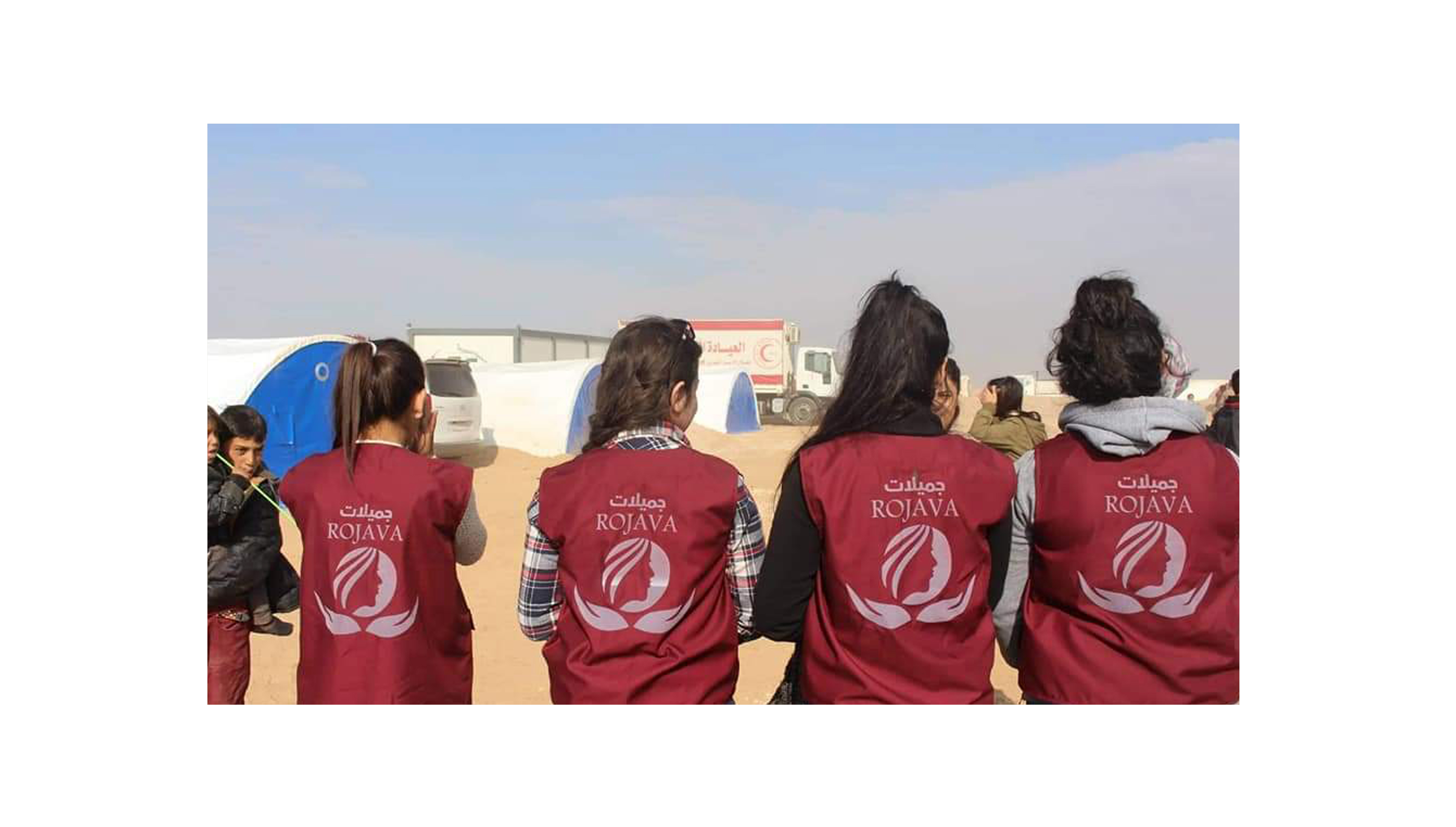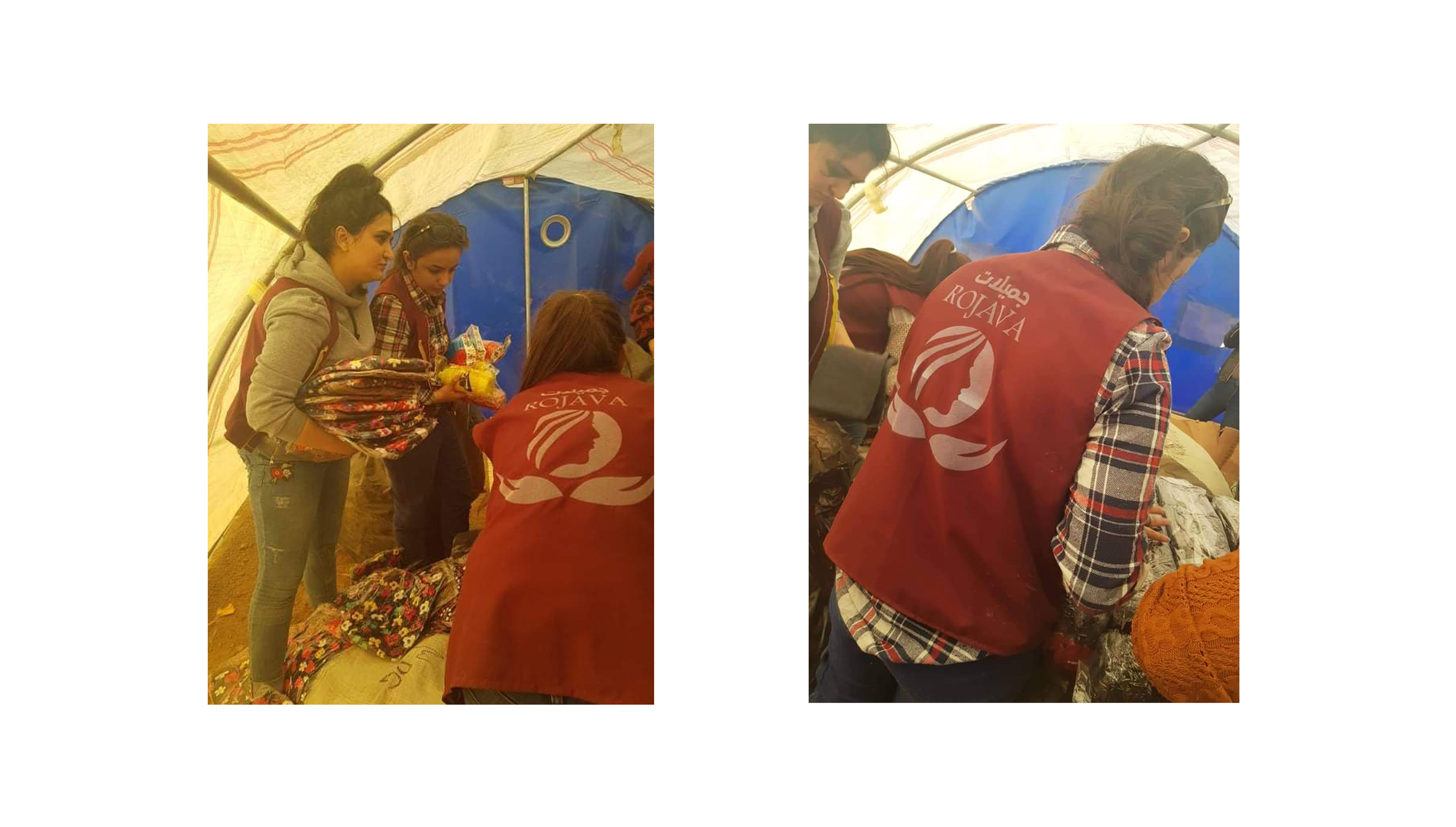 متطوعات من مجموعة جميلات روج آفا يوزعنَ مواداً غذائية وأخرى غير غذائية في مخيم “واشوكاني” قرب مدينة الحسكة، والذي أنشئ لاستقبال النازحين/ات من مدينة رأس العين عقب سيطرة الجيش التركي وفصائل سوريا موالية له على المدينة.